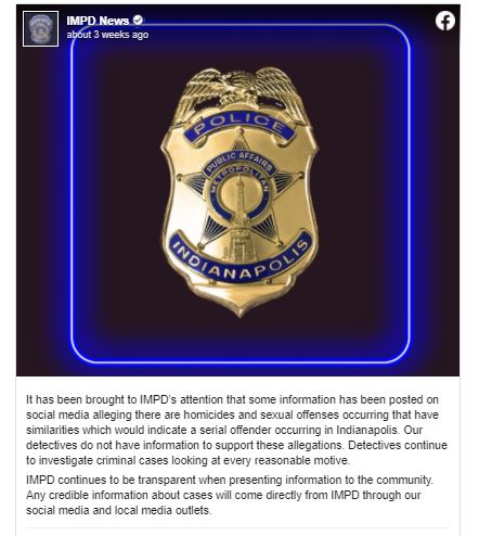 Many Indianapolis citizens were startled a few weeks ago when IMPD issued just such a statement in regard to a rumor making the rounds on local Facebook groups and chat boards at the time. According to a since-deleted post, a Twitter user stated an active serial killer has been targeting women and teenagers, claiming at least a dozen victims before dumping their bodies in wooded areas just south of I-465. The Twitter post then moved over to Facebook, where it was shared hundreds of times. However, authorities say the rumor is false and there is no evidence to support the allegations. “Detectives continue to investigate criminal cases looking at every reasonable motive,” asserted Officer Genae Cook.